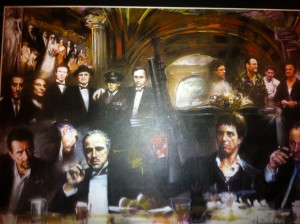 Este es un cuadro de mafiosos que compre en New York a uno de los muchos pintores que hay en Central Park, me hizo gracia, es muy cinefilo, porque es un popurri de los mejores mafiosos tanto de cine, podemos ver al Padrino y arriba la foto de la familia Corleone el dia de la boda de Connieny en medio al Padrino con sus hijos Sonny, Fedro y Michael. Al lado esta Robert DeNiro en Heat y arriba esta el mismo con Joe Pesci en Uno de los nuestros, tambien esta Al Pacino en Scarface y de la tv el mafioso por excelencia James Gandolfini y Cia. en Los Soprano.