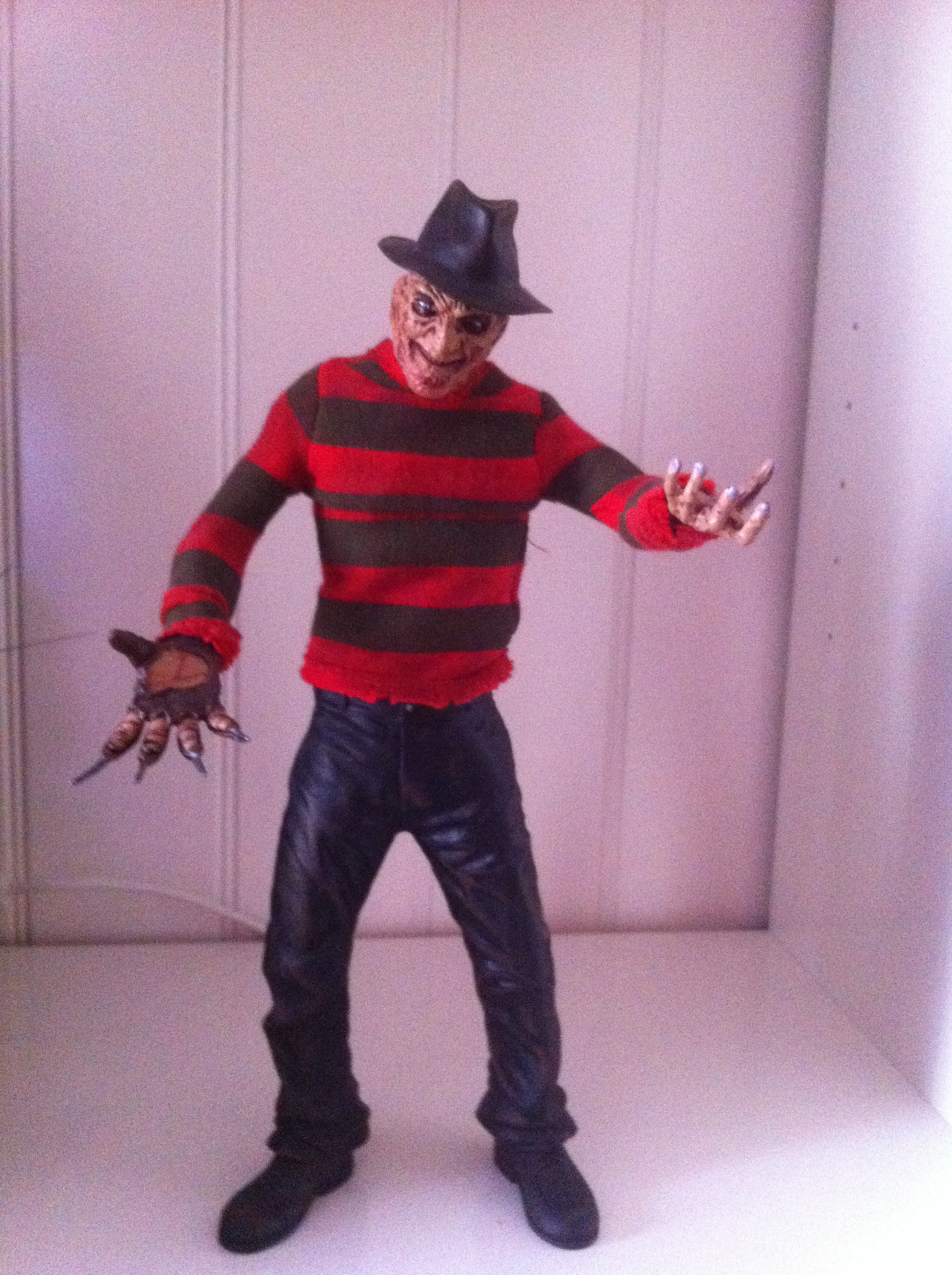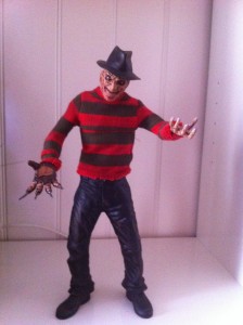 Muchos personajes terrorificos han pasado a la historia del cine y uno de ellos, mitico es Freddy Krueger, monstruo principal de la no menos mitica saga de «Pesadilla en Elm St.» con todas sus secuelas, que aprovecha cuando estan dormidos para meterse en sus suenos y atacarles, empiezate a preocupar cuando se oye la cancion «un, dos mantante despierto, tres cuatro, coge el crucifijo,…..» . El personaje con su cara quemada, su gorro, su gersey de rayas y su caracteristica guante de cuchillas, hizo que muchos de mi generacion nos cagaramos de miedo.