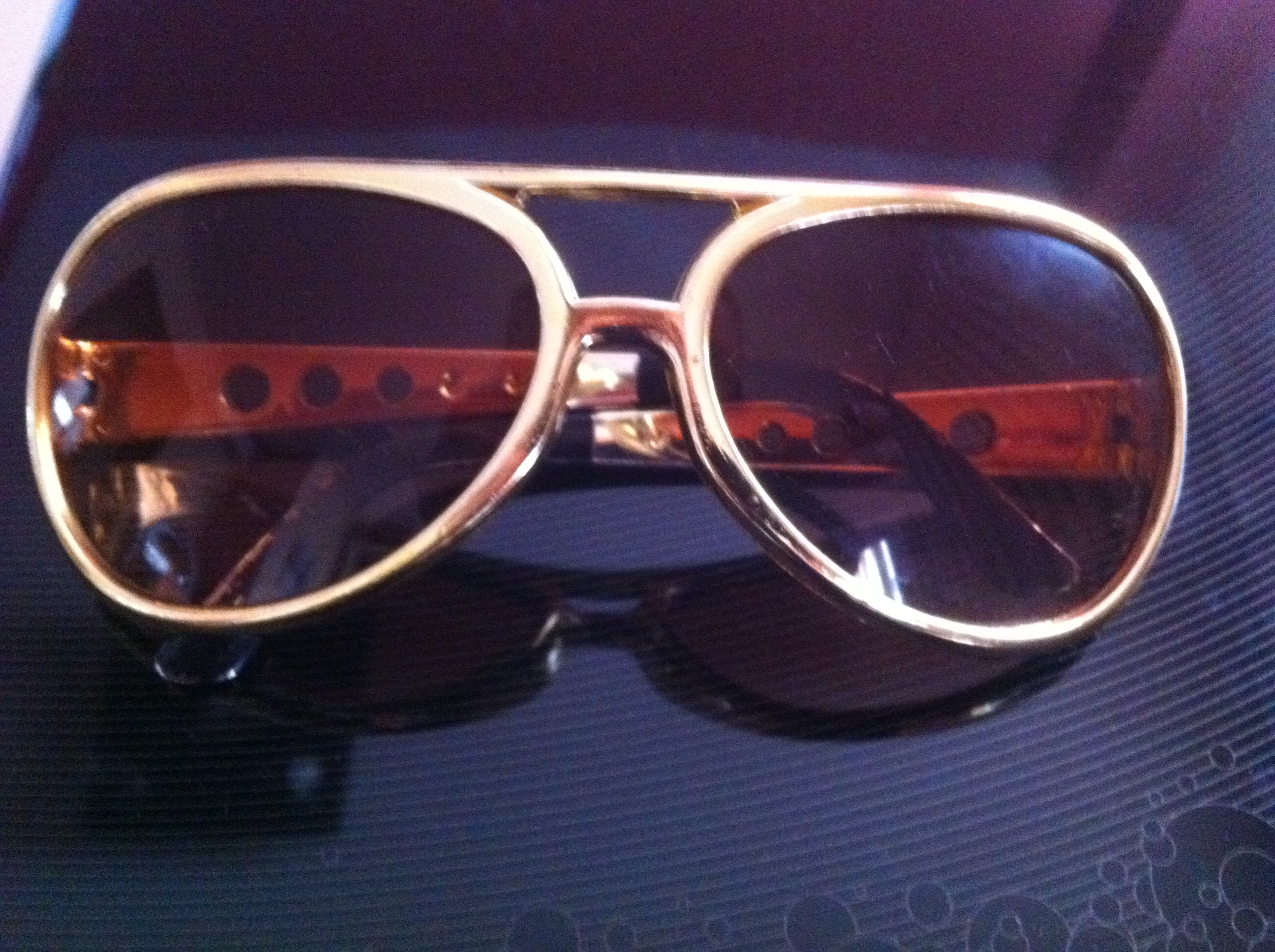 Son las gafas de un amigo, al mas puro estilo Elvis, el gran Elvis, que entre muchas cosas nos ha dejado una estetica fantastica: sus trajes, sus gafas,…. un mito. Tambien pueden ser las gafas de Clarence en » Amor a quemaropa» buenisima.