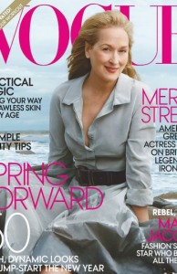 A sus 62 años y esplendida como siempre la gran Meryl Streep se ha convertido este mes en la portada de la revista Vogue de Enero, demostrandonos su sensillez, elegancia y dando una leccion de clase con unas fotografias exquesitas, como siempre, de Annie Liebovitz. Y ademas batiendo records ya que se ha convertido en la  mujer mas madura que ha salido en la portada y para los mas cinefilos un guiño gracioso ya que posa en la revista en la que teoricamente se basaba «El diario se viste de Prada».
