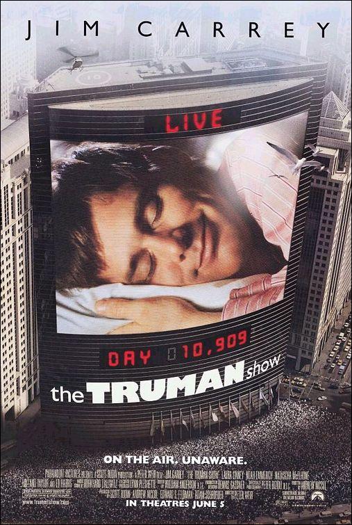 Comentario: Una película distinta, tengo que admitir que hay que verla en su momento porque yo lo había intentado no la terminaba pero lo conseguí y es algo peculiar, la forma de ver la vida en directo y de como nos relacionamos consciente e inconscientemente con las personas y las situaciones. Y todo lo conocemos a través de Truman un joven ingenuo con una vida perfectamente normal y ese es el problema, que sin el saberlo su vida es un reality show. Pero una serie de circunstancias le hacen sospechar de que algo raro esta pasando con el y su vida y de que necesita respuestas. Así que ya tenemos el lío servido, ya he dicho que no es un peliculon, pero se puede ver de vez en cuando sin repetir demasiado. Con un muy buena interpretación de Jim Carrey, excesivo como siempre pero mas contenido.
