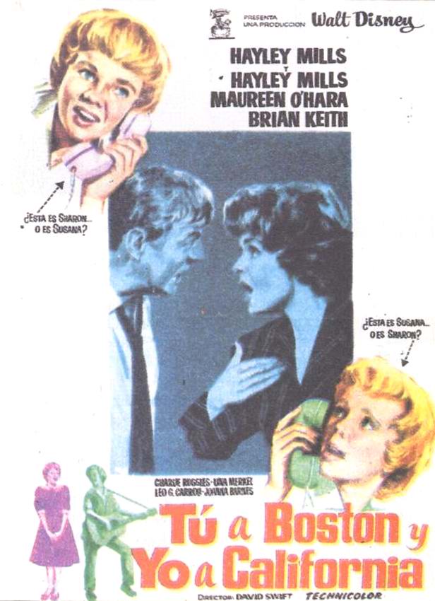 En la pelicula, durante un campamento de verano dos alumnas descubriran que son hermanas gemelas y que sus padres al divorciarse las separaron (un clasico recurrente). Asi que decidiran intercambiarse para conocer su propia historia y al resto de su familia. Divertidisima, inocente y genial.No quiero dejar pasar la oportunidad de recordar a la gran Maureen O’Hara y Hayle Mills, actriz de la casa Disney, madre mia como llore con Pollyana.